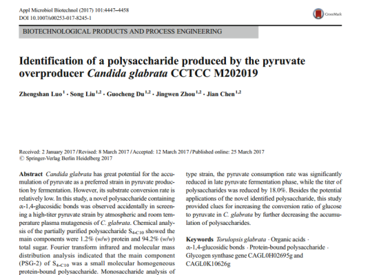 本期向您推荐江南大学陈坚、堵国成、周景文教授科研团队,利用ARTP技术筛选高产丙酮酸菌株,却意外发现突变株产α-1,4-糖苷键的新型多糖。经过对多糖的成分及其合成途径的关键基因进行分析,揭示了多糖高效合成,丙酮酸低效转化,及丙酮酸发酵后期糖异生的原因。本研究2017年3月发表在《Appl Microbiol Biotechnol》上(文章题目:Identification of a polysaccharide produced by the pyruvate overproducer Candida glabrata CCTCC M202019)。