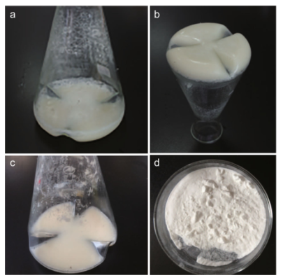 Fig. 1 Culture broth of wild-type and strain 4-C10. a Culture broth of strain 4-C10 after 30 min. b Culture broth of strain 4-C10 (inverted) after 30 min. c Culture broth of CCTCC M202019 after 30 min. d The partially purified S4-C10 polymer from the culture broth of strain 4-C10