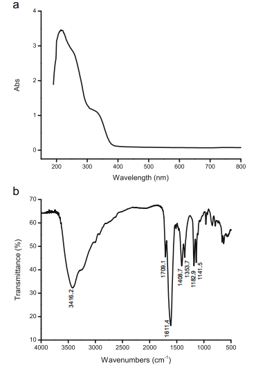 Fig. 2 The infrared spectra and UV of the partially purified S4-C10 polymer. a An aqueous solution of S4-C10 polysaccharides was examined with a UV–visible spectrophotometer over a wave number range of 190–800 nm. b Infrared spectra of the dried S4-C10 polysaccharide in the KBr pellet were examined over a wave number range of 400–4000 cm