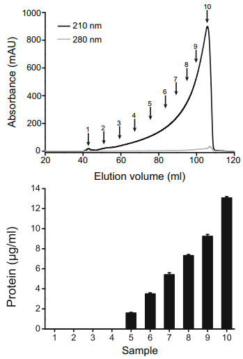 Fig. 3 Chromatography of the S4-C10 polymer on a Superdex 200 column detected by an AKTA purifier system. a The process of S4-C10 purification. Black and gray lines represent the absorbance at 210 and 280 nm; 1, 2...10 represent different components at different eluent times. Sequentially eluting peak labeled PSG-1, PSG-2 from left to right at 210 nm. b The protein content of different samples at different elution times from the purification process with the AKTA purifier system (GE Healthcare, Houston, TX, USA) with water as the mobile phase at a flow rate of 1.0 mL min.