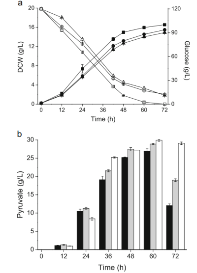 Fig. 8 Effect of knocking out CAGL0H02695g and CAGL0K10626g on pyruvate production in C. glabrata. Wild-type C. glabrata was fermented with T.GΔarg8 (CAGL0H02695g::ARG8) and CGΔarg8Δura3 (CAGL0H02695g::ARG8; CAGL0K10626g::URA3) at 30 °C in a 500-mL flask with shaking at 220 rpm for 72 h. a The change of glucose and DCW in the fermentation process. Glucose (C. glabrata, open square; CGΔarg8 (CAGL0H02695g::ARG8), open circles; CGΔarg8Δura3 (CAGL0H02695g::ARG8; CAGL0K10626g:: URA3), open triangle); DCW (C. glabrata, black squares; CGΔarg8 (CAGL0H02695g::ARG8), black circles; CGΔarg8Δura3 (CAGL0H02695g::ARG8; CAGL0K10626g::URA3), black triangle). b The change of pyruvate in the fermentation process. Pyruvate (C. glabrata, black bars; CGΔarg8 (CAGL0H02695g::ARG8), gray bars ; CG Δa r g8Δ ura3 ( CAGL0 H 02695 g : : ARG8 ;CAGL0K10626g::URA3), white bars)