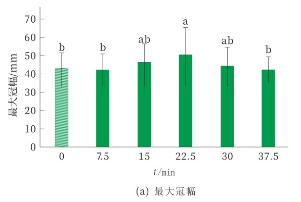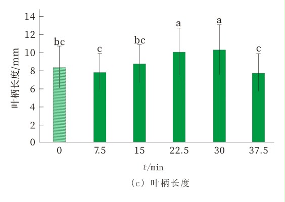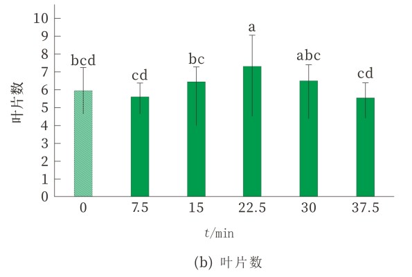 图2 ARTP 辐照对‘昆仑雪菊’幼苗最大冠幅(a)、叶片数(b)和叶柄数(c)的影响(40 d)
