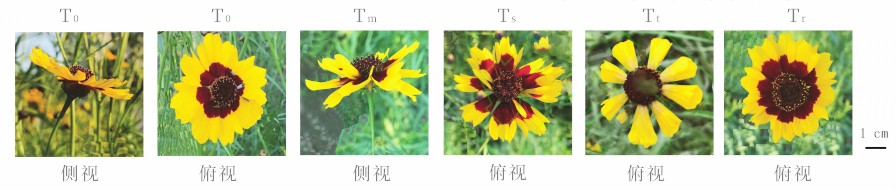 本研究首次采用ARTP处理两色金鸡菊(Coreopsis tinctoria Nutt.)种子,研究其对种子萌发、幼苗生长、花形和品质的影响,以期获得观赏价值大、品质好的诱变品系。结果表明:(1)与对照相比,不同时间(7.50~37.50min)的 ARTP辐照提高了两色金鸡菊种子的发芽势和发芽率,辐照22.50min时其发芽势(80.00%)和发芽率(86.70%)达最大;不同时间的ARTP辐照也不同程度地增加了其幼苗的最大冠幅、叶片数量、叶柄长度、叶面积,以22.50min的辐照效果最好。(2)ARTP辐照种子22.50min后,其大部分植株最大花径明显增加、舌状花红褐色区域明显增大,13.33%的植株舌状花瓣数增多(Tm)、6.67%的植株雄蕊瓣化(Ts)、6.67%的植株舌状花管状化(似喇叭状)(Tt);部分植株花朵总黄酮、绿原酸和木犀草苷成分增加,其中Tt植株不仅花形发生变化且活性成分也有所提高。