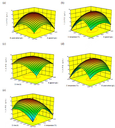 Fig.5 3D response surface plots that shows the effect of each independent variable and their interaction on the production of 1,3-PD at p<0.05.