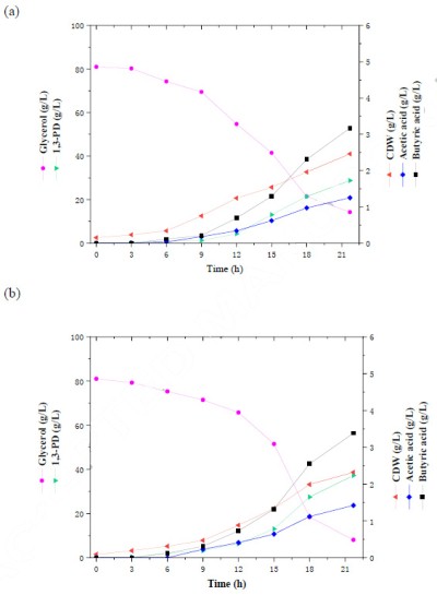 Fig.6 Batch fermentation by C.butyricum mutant strain YP855(a)and wild strain(b)under the optimum conditions.