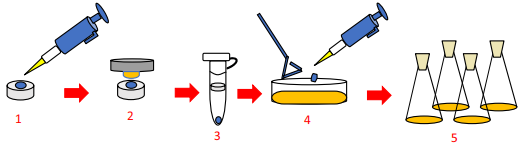 图1 ARTP诱变过程(1.上样.;2.等离子体处理;3.菌体洗脱;4.平板筛选;5.菌种筛选)