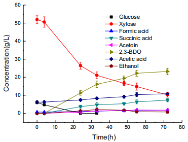 Fig.5 Co-production of 2,3-BDO and organic acids by M22 with non-detoxified hydrolysate