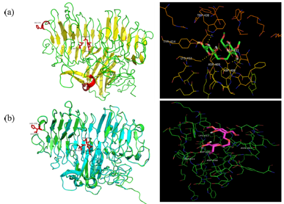 Fig.6 Three-dimensional modeling and molecular docking with isomaltose of dextranase from wild-type Chaetomium globosum (a) and C. globosum M101 (b)