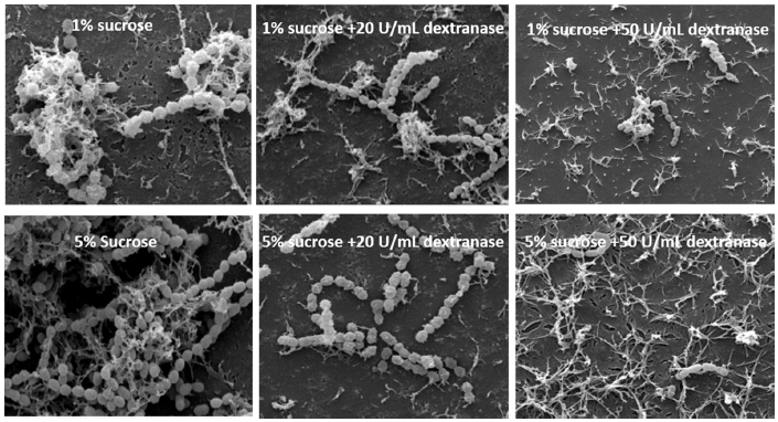 图8 右旋糖苷酶对生物膜降解影响的电镜观察