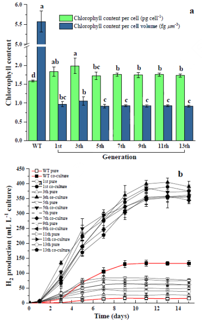 氢(Hydrogen),由于其高能量密度、清洁及可再生等特点,使得它成为未来化石燃料的理想替代品。然而,目前高达96%的氢能是由化石燃料产生的,这远远不能满足减少温室气体排放的需求。绿藻类通过光合作用介导的水光解过程产氢是负碳的,且能耗低,对环境友好。在藻类产氢过程中,氢酶对氧气的高敏感性和光合作用中光转换效率低是主要的瓶颈,降低叶绿素天线尺寸有助于提高光合作用效率。为减小叶绿素天线尺寸,提高氢产量,本研究利用常压室温等离子体(ARTP)对莱茵衣藻进行诱变。通过筛选获得的突变体在纯培养和共培养中其产氢量分别比野生型提高1.8-5.2倍(28.5-84.1mL/L)和2.7-3.1倍(356.5-405.2mL/L)。与野生型藻类相比,突变体在琼脂平板上的菌落颜色为浅绿色,细胞直径约为野生型的2倍,叶绿素含量比野生型低5.3-6.1倍。比较转录组分析结果表明,大多数突变基因与光合作用相关(光系统Ⅰ,Ⅱ,细胞色素b6/f复合体、光合电子传递、F型ATP酶)且突变体细胞LHC蛋白表达提高,说明光合效率提高。常压室温等离子体(ARTP)是一种基于氦气的大气压射频辉光放电等离子体的全细胞诱变新技术,具有传统紫外辐射或化学诱变剂无法比拟的优点。ARTP能有效地引起DNA多样性损伤,进而提高突变率,且不产生有毒有害物质。它已成功地应用于提高许多细菌、真菌和藻类物种的生物量和代谢物产量。本研究旨在利用ARTP诱变截短莱茵衣藻叶绿素天线,提高藻类产氢,并在转录水平上比较野生型与突变型,分析其可能的机制。