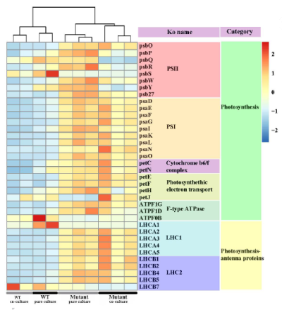图2 纯培养或共培养的莱茵衣藻野生型和ARTP突变型中与光合作用相关基因表达的热图分析