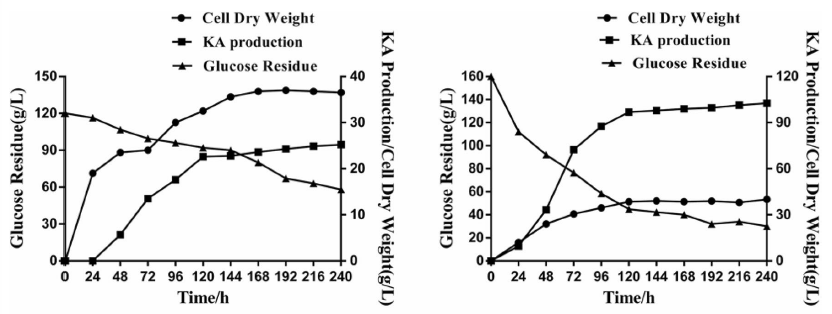 图3 初始菌株KA-11(左)与突变菌株AR-47(右)的发酵曲线比较
