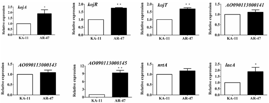 图4 初始菌株KA-11与突变菌株AR-47中被选基因的转录表达水平比较,*P < 0.05, **P < 0.01