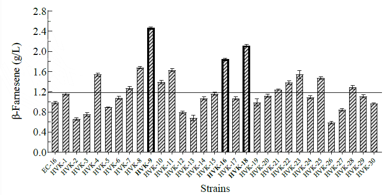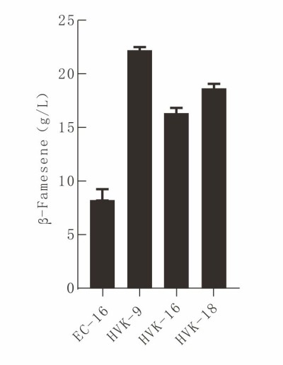 图6 发酵96h后出发菌株E.coli EC-16和突变株HVK-9,HVK-16,HVK-18的β-法尼烯产量