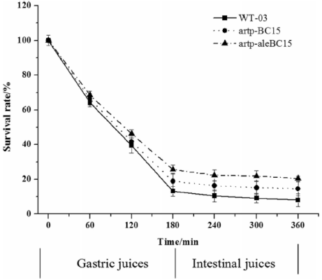 图2 凝结芽孢杆菌WT-03、artp-BC15和artp-aleBC15在模拟胃肠道系统的存活率