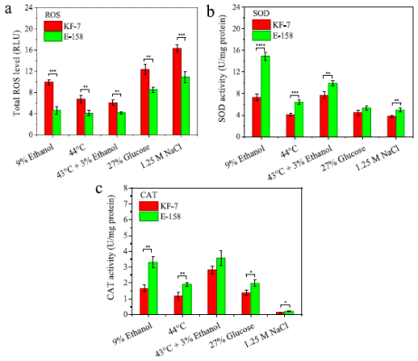 本研究采用常压室温等离子体(ARTP)诱变结合基因组改组和杂交的方法,成功获得了一株耐多种胁迫的工业酿酒酵母菌株E-158。与出发菌株KF-7相比,菌株E-158在不同胁迫条件下均能更好地生长。在高乙醇、高温、高渗透胁迫条件下,E-158菌株在分批发酵过程中产生的乙醇浓度比KF-7菌株高10.14%~81.02%。E-158经过30次传代培养后,其抗逆性仍保持稳定。菌株E-158的活性氧(ROS)水平较低,超氧化物歧化酶(SOD)和过氧化氢酶(CAT)活性较高,表明E-158的抗氧化防御能力得到了显著提高,是E-158耐多种胁迫的原因之一。本研究为工业酒精生产提供了一株抗逆性优良的菌株,为选育具有多重抗逆性的工业酿酒酵母菌株提供了可行的策略。
