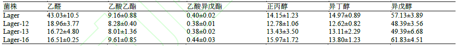 表4 Lager、Lager-12、Lager-13及Lager-16发酵结束时酒样中的主要风味指标/(mg/L)
