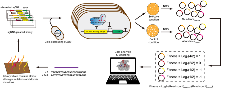 近年来,作为可编程的DNA靶向工具,CRISPR/(d)Cas系统在基因编辑、高通量遗传筛选、染色体成像、合成基因路线构建、新型抗菌药物和体外核酸检测等领域得到了广泛的应用。对于每个应用而言,向导RNA(sgRNA)与靶标DNA之间的序列同源性对CRISPR/(d)Cas系统活性的影响都是至关重要的。为加深对这个问题的理解,作者构建了两个覆盖所有单核苷酸和双核苷酸突变的sgRNA文库,并利用高通量的方法在活细胞内解析了文库中每个sgRNA介导dCas9与靶标DNA结合的亲和力。