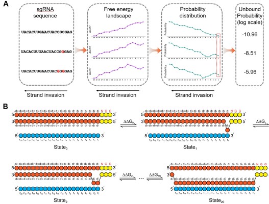 CRISPR/(d)Cas9识别并结合靶标主要分为两个步骤,首先是PAM (NGG)的识别及其近邻碱基的熔化,接着是链侵入过程,即sgRNA与熔化的靶标DNA发生退火,并延伸至PAM远端。基于CRISPR/(d)Cas9的结合机理和实验观测,论文将链侵入过程的状态转移视作马尔可夫链,并使用文献报道的核酸热力学数据计算每个状态的概率,最终发现dCas9的解离概率与结合亲和力存在较强的负相关关系,并能很好的与文献报道的体外实验数据吻合。该模型也能外推至更多错配的情形,一定程度上证明了其普适性,对于深入理解和应用CRISPR系统的脱靶结合效应具有重要意义。