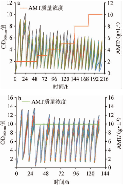 图4 组氨酸类似物3-氨基-1,2,4-三氮唑不同含量条件下菌体生长曲线