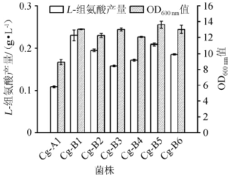 图5 驯化后菌株摇瓶发酵OD600nm值和L-组氨酸产量