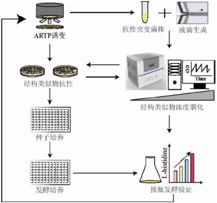 常压室温等离子体(atmospheric and room temperature plasma,ARTP)是一种新型的诱变技术,因其具有突变率高、环境友好、操作安全等优势,已被广泛应用于氨基酸、维生素、二十二碳六烯酸等高产菌株的选育。虽然ARTP诱变在突变库容量、突变率等方面发挥的巨大优势,但突变后的菌株仍然面临筛选工作量大的问题。近期基于微流控技术开发出的全自动高通量微生物液滴培养系统(microbialmicrodropletculture system,MMC)具有高通量、自动培养、自动传代、化学因子梯度添加、在线检测液滴的生长以及微生物分选等功能,目前已被用于菌种压力富集筛选、菌种适应性进化等方面的研究。本研究通过ARTP与MMC联用的方法快速获得一株L-组氨酸高产菌,为今后的育种工作提供重要的技术参考。