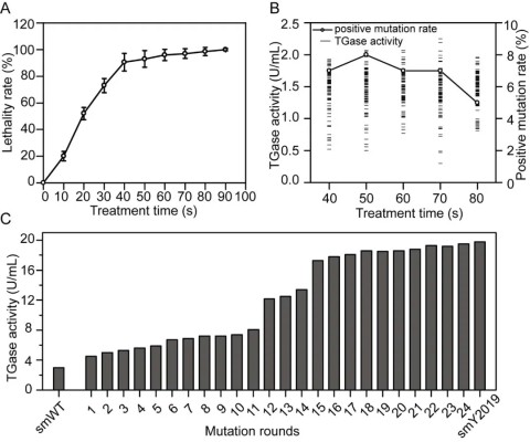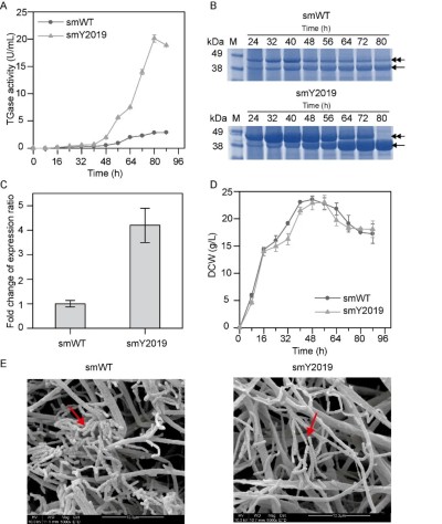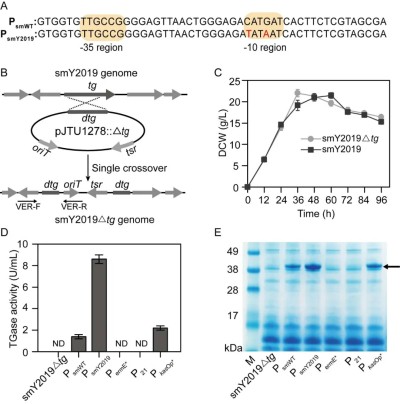 针对上述问题,本研究团队结合随机诱变及定点基因改造提高了茂原链霉菌中谷氨酰胺转氨酶的产量。首先,对S. mobaraensisDSM40587 (smWT)进行ARTP诱变,然后从大约3000(个)×25(轮)突变体中筛选出TGase产量提高5.5倍的突变体(smY2019)。与smWT相比,smY2019中TGase的mRNA水平提高了3.2倍,且发现TGase启动子产生突变。在TGase敲除菌株中回补表达分析表明,突变的TGase启动子比野生型的启动子更强。最后,我们在smY2019基因组中整合了额外的两个TGase表达盒,得到了重组菌株smY2019-3C,TGase的产量进一步提高103%,产量达到40 U/mL。S. mobaraensis是目前唯一被我国《食品添加剂使用标准》(GB2760-2014)和美国食品药品监督管理局认证用于食品级TGase生产的菌株。本研究得到的高菌株将有助于提高食品级TGase工业化生产水平。