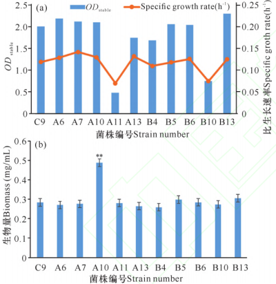 图4 突变菌株的稳定期OD600、比生长速率(a)和生物量(b)