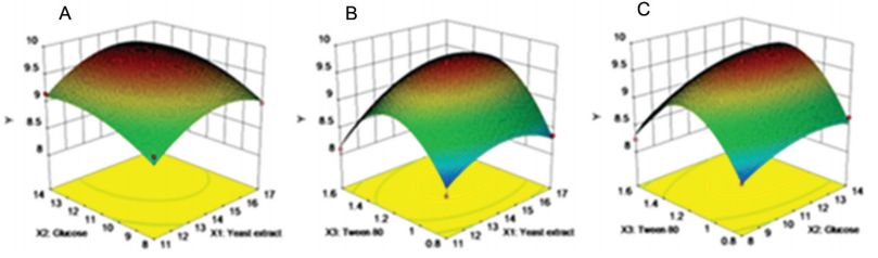 图3 响应面分析不同因素交互作用对壳聚糖酶活性影响