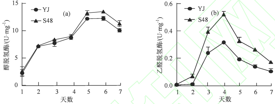 图5 发酵过程中醇脱氢酶(a)以及乙醛脱氢酶酶活情况(b)