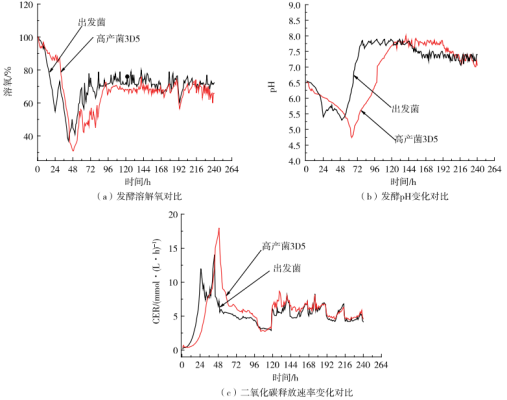 图6 5L生物发酵罐上高产株与出发株的在线参数变化