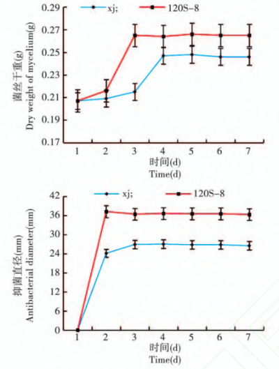 在本研究中,ARTP诱变黑曲霉xj 120 s时,我们筛选得到一株遗传稳定且具有高效拮抗能力的菌株120S-8,菌株120S-8连续传代14代变异系数比出发菌小且抑菌活性无明显下降,菌株120S-8抑菌圈直径(36.43 mm±1.41 mm)相比出发菌抑菌圈直径(27.85 mm±2.22 mm)增加30.8%,生长稳定期(3 d)较出发菌株(4 d)提前1d到达,最小抑菌浓度(7.50 g/L)较出发菌株(15g/L)低50%,且抑菌谱更广。常压室温等离子体诱变技术处理黑曲霉xj后,菌株抑菌活性在现有基础上提高了50%,同时遗传性稳定性增强了13.5%。为研发黑曲霉应用于青枯病的生物防治提供菌株资源。