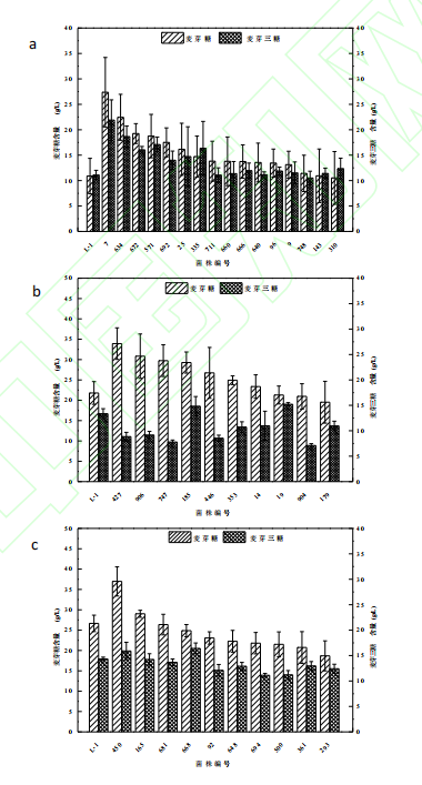 图3 第二轮复筛麦芽糖与麦芽三糖含量测定结果