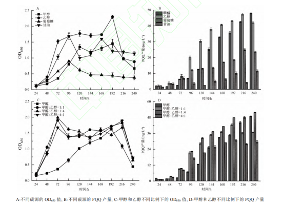 图 4 不同碳源对生物量和 PQQ 产量的影响