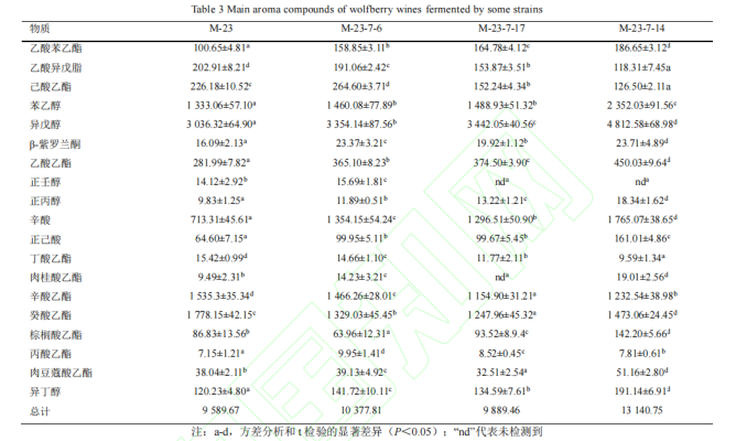 本研究中,通过常压室温等离子体对酿酒酵母 M-23 进行诱变,结合高通量筛选技术,最终选育出酿酒酵母菌株 M-23-7-14。采用气相色谱-质谱法对自酿枸杞酒和 2 种市售枸杞酒(健康快车、金色传杞)中的主要挥发性化合物进行定性和定量研究,并结合气味活性值分析,评价不同枸杞酒的香气特征。结果表明:选育的酿酒酵母与市售酿酒酵母在发酵枸杞酒的基本理化指标上无显著差异,其中,选育获得的 M-23-7-14 与出发菌株 M-23 相比,枸杞酒的主要风味物质相对总量提高了 37.0%,并在感官评价中有最高得分;3 种枸杞酒中 OAV>1 的物质分别为 9、7 和 7 种,其中,自酿枸杞酒中挥发性化合物的种类和含量均高于 2 种市售枸杞酒;乙酸异戊酯、丙醇和异戊醇是对 3 种枸杞酒贡献最大的特征香气成分。该文通过采用 ARTP 和 HTS 相结合的方法选育出酿酒酵母 M-23-7-14。为解决枸杞酒香气不足、缺乏典型性的问题提供了理论依据,对枸杞酒产业的发展具有一定的意义。