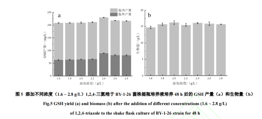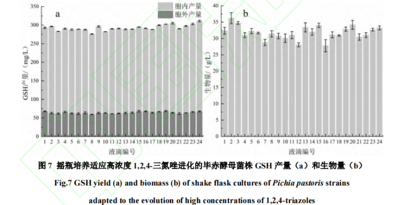 本研究为提升野生毕赤酵母菌株 BY-1 产谷胱甘肽的能力,通过常压室温等离子体诱变技术得到诱变菌株 BY-1-26。进一步在摇瓶培养过程中添加 1,2,4-三氮唑,提高诱变菌株产量。最后将 1,2,4-三氮唑作为筛选因子,利用微生物微液滴培养仪对诱变菌株进行适应性进化,获得了一株高产谷胱甘肽的突变株 BY-2-24,并对其遗传稳定性进行研究。结果表明:出发菌株 BY-1 经过 ARTP 诱变处理、抗性梯度平板初筛、MMC 适应性进化、摇瓶复筛等,可以选育高产谷胱甘肽突变株。突变株 BY-2-24 摇瓶产量达 312.13 ± 2.62 mg/L,较出发菌株提高 134.26%,且经过 7 次传代培养,仍然具有较好的遗传稳定性。同时,生物量提高 118.33%,表明诱变菌株的生长能力得到提高。本研究表明:ARTP 与 MMC 联合应用作为一种简便高效的微生物诱变方式,可用于定向诱变筛选高性能微生物菌株,为高通量选育目标菌株提供了参考。