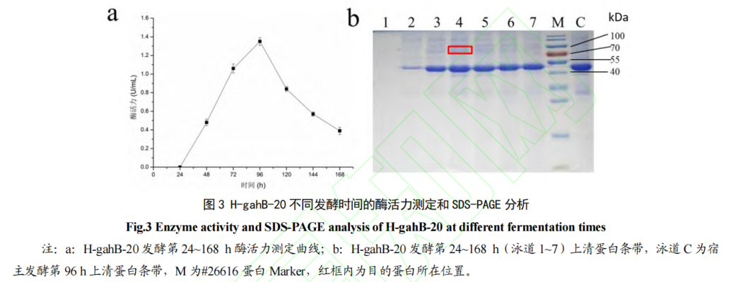 本研究将米曲霉 RIB40来源的谷氨酰胺酶在黑曲霉宿主中分泌表达。基于该研究所建立表型鉴定板与孔板培养的通量鉴定筛选方法成功得到重组表达谷氨酰胺酶的转化子 H-gahB,最高酶活力达到 1.35 U/mL。为了增加目的基因在宿主中的拷贝数,采用 CRISPR/Cas9 基因组编辑技术重新构建高拷贝的谷氨酰胺酶表达菌株C-gahB,其酶活力提高到 3.56 U/mL,约为 H-gahB 的 2.64 倍。进一步采用 ARTP 诱变技术对工程菌进行诱变,获得了谷氨酰胺酶工程菌株 A-gahB,其酶活力提升到 4.16 U/mL,比出发菌株 C-gahB 的酶活力提高了 0.17 倍。纯化后的重组 gahB 的比酶活达到 40.63 U/mg,最适温度为 37 ℃,最适 pH 为 7.0,其在 20 ℃至 40 ℃及 pH 5.5 至 8.0 之间稳定性较好。K+对 gahB 的酶活力具有激活作用,Zn2+和 Mn2+则对 gahB 的酶活力有较为强烈的抑制作用。当盐浓度为 18%时,gahB 表现出 35.38%的相对酶活力。本研究首次在黑曲霉中实现了来源于米曲霉 RIB40 的谷氨酰胺酶 gahB 的重组分泌表达,为此后对米曲霉谷氨酰胺酶的研究提供了基础。