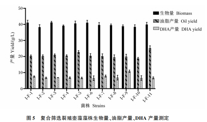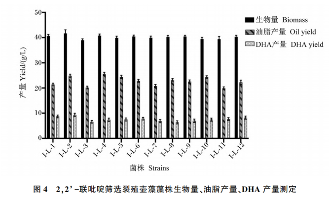 本研究旨在通过诱变选育得到一株高产DHA的裂殖壶藻藻株,为进一步开发缓解幼龄动物腹泻的新型饲料奠定基础。使用裂殖壶藻原始藻株 ATCC20888,通过常压室温等离子体(ARTP)对藻株进行诱变,再进一步通过建立丙二酸、2,2'-联吡啶及丙二酸-2,2'-联吡啶复合筛选方法对诱变藻株进行快速筛选,对筛选突变藻株进行摇瓶发酵,利用磷酸香草醛法和高效气相色谱法对突变藻株的油脂、DHA产量快速检测,得到高产DHA的藻株。结果表明:丙二酸、2,2'-联吡啶及丙二酸-2,2'-联吡啶复合筛选均可以提高裂殖壶藻藻株的平均DHA 产量,较原始藻株分别提高了32.20%、25.01%和29.71%。通过丙二酸-2,2'-联吡啶复合筛选得到的诱变藻株I-F-9,其DHA含量(54.56%)及产量(10.88g/L)分别比原始菌株增加了74.62%和61.17%(P<0.05)。由此可见,通过ARTP选育的裂殖壶藻藻株I-F-9 较原始藻株 DHA 含量及产量均有显著提高,且其 DHA 产量处于目前同类研究前列。