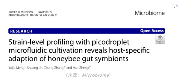 近日,中国农业大学的郑浩团队和清华大学的张翀团队在 Microbiome 上发表了名为“Strain-level profiling with picodroplet microfluidic cultivation reveals host-specific adaption of honeybee gut symbionts”的研究论文,使用高通量皮升级液滴微流控细胞分选仪(DREM cell)开发基于液滴的微流控技术培养蜜蜂肠道微生物,验证了微流控液滴平台在肠道微生物培养组学中的可行性,为更复杂微生物群落的大规模研究铺平了道路。
