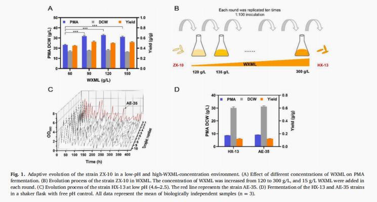 本期为您推荐西南大学邹祥教授研究团队发表在《Chemical Engineering Journal》上的一篇文章:Bio-refinery of xylose processing wastes for green polymalic acid production and L-malic acid recovery by engineered Aureobasidium pullulans in a non-waste-disposal system。使用全自动高通量微生物液滴培养仪(MMC)提高了该出芽短梗霉在低pH下的细胞耐受性,研究了在低pH条件下使用高浓度含废木糖母液(WXML)高效生产聚苹果酸(PMA)和无钙废物污染L-MA回收的可行性[1]。