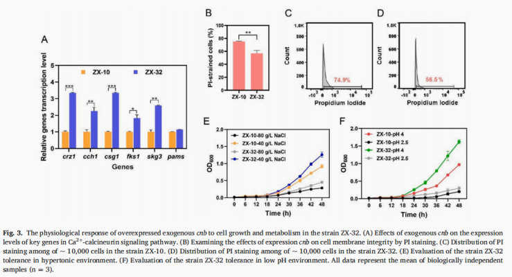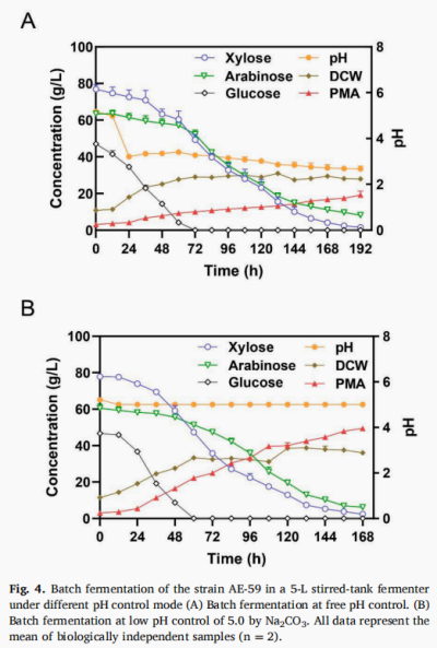 针对这些产业技术难题,本研究评估了在无废物处理系统中,以低pH控制和L-MA回收为前提,使用WXML进行高效PMA发酵的可行性。为了在高浓度WXML条件下对出芽短梗霉ZX-10进行适应性进化,在种子培养基中WXML浓度从120 g/L逐渐增加到300 g/L,每个梯度增加15 g/L并重复10次,成功分离出WXML耐受菌株HX-13;为了提高在低pH下的细胞耐受性,菌株HX-13在MMC中驯化,在初始对数阶段,传代时间设定为15小时,pH值从4.6逐渐降低至2.5,分离出耐低pH的菌株AE-35。随后,引入外源白僵菌钙调信号编码基因,通过钙调信号工程策略进一步强化菌株的低pH抗逆性能,并获得了一株突变菌株AE-59。在5L发酵罐中用Na2CO3进行低pH控制时,PMA效价达到49.47±0.48g/L,产量达到0.33g/g。最后,采用全水相结晶法(DAPC),使用低剂量硫酸进行酸水解,从酸性下游培养基中获得总L-MA的78.55%(纯度为95.4%),结果表明在低pH模式下使用Na2CO3生产L-MA是可行的。本研究克服了钙废物污染对未来工业发酵L-MA生产的主要障碍,并为未来生物聚合物和羧酸的生产提供了一条绿色可持续的生物炼制路线。