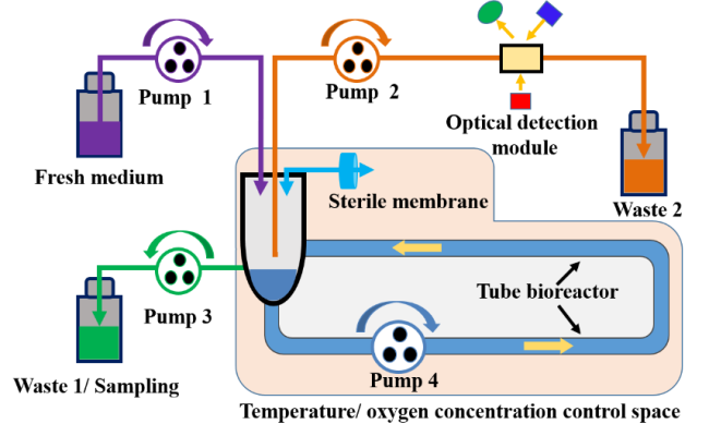该研究中,作者首先对不同内径微管路在不同流速条件下的溶氧能力进行了理论分析和实验测定,通过研究发现,随着管径减小、流速增加,其氧气传质能力快速增强。相对传统的微型生物反应器,其氧体积转移系数(KLa)具有显著优势。为进一步验证微型管式反应器对微生物的培养能力,作者对该反应器进行装备化开发,其工作原理如图1所示。微型管式反应器具有体积小、渗透供氧特点,使其溶氧控制更加简单,通过调控管路周围环境中氧气浓度既可改变溶氧性能。通过对6株代表性微生物在MTB中进行批量培养,作者进一步验证了MTB培养性能优于摇瓶。此外,在MTB中还实现了典型的好氧菌枯草芽孢杆菌分批补料培养和厌氧菌植物乳杆菌的耐氧适应性进化,并均取得良好效果。
