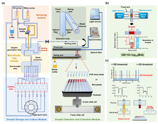 单克隆菌落的分离、培养和挑取是微生物研究的关键操作。1881年,Robert Koch发明了在固体平板上进行微生物纯培养的方法,已经成为微生物单克隆培养和挑取的标准方法之一。然而在面对日益多样的高通量需求时,基于固体平板的方法由于通量低、培养基利用率低以及存在大量的人工操作,通常要消耗大量人力物力。虽然近些年也发展了一些整合菌落挑取仪、移液工作站等仪器与机械臂的自动化工作站,但这种平台复杂而昂贵。近年来液滴微流控技术的发展为自动化高通量微生物培养和筛选提供了新的解决方案。然而目前大多数相关系统使用皮纳升液滴,由于其体积小,导致检测方面诸如检测灵敏度低,高度依赖特定的化学试剂和探针,检测设备复杂昂贵等问题。同时这些系统通常以堆叠的方式培养液滴,较难单独和依次收集目标液滴,不能完全实现单克隆菌落的单独获取。