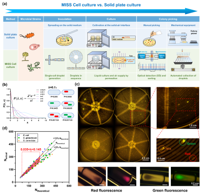 图2 MISS Cell中单克隆培养和分选的操作流程和验证结果。(a)固体平板方法和MISS Cell培方法的操作流程比较;(b)单细胞液滴生成的原理和双色荧光菌体系验证原理;(c)使用红色和绿色荧光标记的大肠杆菌的验证结果,λ=0.086;(d)使用大肠杆菌、谷氨酸棒杆菌和酿酒酵母进行验证的结果汇总。