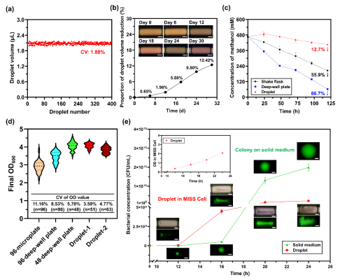 图3 MISS Cell中微升级液滴性能表征。(a)生成液滴的体积变化;(b)液滴挥发情况;(c)液滴中底物(以甲醇为例)的挥发情况;(d)不同方法微生物培养的平行性;(e)微升级液滴和固体平板中单菌落生长速率比较。Scale bar = 400 μm。