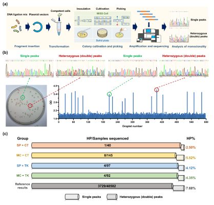 图4 MISS Cell中分子克隆的培养和分选。(a)使用MISS Cell和固体平板方法进行分子克隆的操作流程;(b)来自固体平板和MISS Cell的不同菌落的测序峰图;(c)使用不同的DNA连接产物的测试结果。