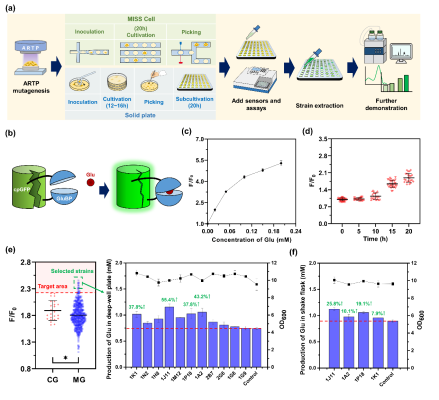 图5 C. glutamicum B2H001在MISS Cell中的筛选流程和结果。(a)MISS Cell和传统固体平板之间的菌种诱变筛选流程比较;(b)iGlusnFr检测Glu的工作示意图;(c)iGlusnFr对Glu的反应曲线;(d)使用iGlusnFr作为传感器在MISS Cell中培养的初始菌株的Glu产量时间曲线;(e)MISS Cell筛选和24深孔板的验证结果;(f)菌株1J11、1A2、1P18和1K1在摇瓶中的进一步验证结果。