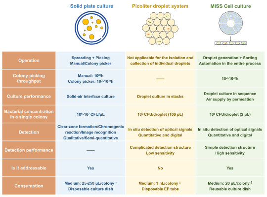 综上,该研究工作开发的微升级单细胞液滴筛选系统(MISS Cell)自动集成化平台,可用于自动化高通量微生物单克隆培养和挑选。与固体平板法相比,MISS Cell具有更高的产量、更低的试剂消耗和更多的自动化操作,可以节省大量的人力和物力。与皮升级液滴相比,MISS Cell使用更简单的光学信号检测,同时可以精准识别液滴,使液滴可寻址(图6)。MISS Cell有望成为一个通用的操作平台,在高通量的应用场景中大大提高单克隆菌落的获取效率,解除固体平板在通量和操作上的限制,以促进生物技术发展。