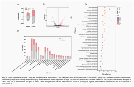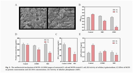 本研究中,以罗伊氏乳杆菌为出发菌株,通过常压室温等离子体(ARTP)技术进行诱变,并使用高通量筛选(HTS)技术筛选对大肠杆菌的抗菌活性提高的突变体,最终筛出突变株AR-148,其无细胞上清液(MCFS)对大肠杆菌的抗菌活性较野生菌株高37%。随后,在细胞水平上研究了MCFS的抗菌作用,包括膜完整性、关键酶的能量代谢、DNA复制和蛋白质合成。结果表明,MCFS通过破坏细胞膜、影响细胞内生物分子(蛋白质和DNA)以及降低细胞内酶(AKPase和β-半乳糖苷酶)的含量来发挥其抗菌作用。进一步的转录组分析证实,MCFS对大肠杆菌中涉及能量代谢、氧化应激、细胞壁和细胞膜完整性以及遗传信息的基因表达有显著影响。本研究首次揭示了MCFS对革兰氏阴性细菌的抗菌机理,为MCFS在食品工业中的进一步开发和应用提供了实验依据。
