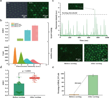基于平板的筛选模式通常耗时且效率低下,因此开发高效的筛选策略以加速定向进化过程具有重要的意义,基于微流控芯片产生的单分散微液滴的单细胞评价已被证明是寻找高性能酶的有效超高通量策略,对获得具有所需性质的目标酶至关重要。微液滴中单细胞的分散可以将基因型与细胞外靶分子关联,使得从大规模文库中富集所需的突变体成为可能,并将筛选所需的时间和成本减少几个数量级。
